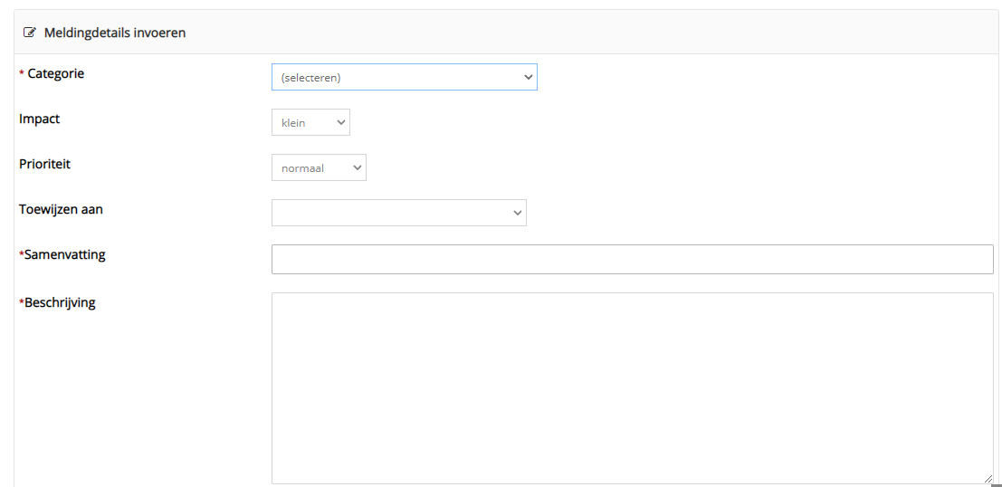 | Bron of Ticketnummer | Vul in hoe het issue doorgegeven is en hoe/waar een terugkoppeling gegeven kan worden. Bijvoorbeeld telefonisch of via e-mail (eventueel met ticketnummer uit eigen systeem). |