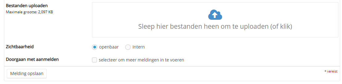 | Bestanden uploaden: | Hier kunnen eventuele foto’s en/of andere bestanden zoals een offerte worden toegevoegd aan de melding. |