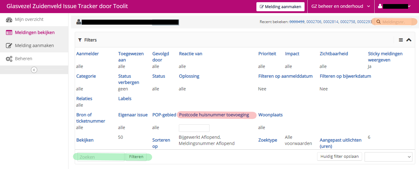 Kies één manier van zoeken en zorg dat alle andere velden leeg zijn. Maak na de zoekopdracht je zoekveld weer leeg en klik op ‘Filteren’ (groen gemarkeerd in afbeelding 1). Op deze manier komen alle meldingen weer tevoorschijn.